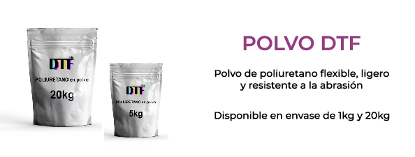 El polvo DTF actúa como adherente entre la tinta y el tejido de la prenda, permitiéndote plancharlo en tejidos como algodón. El polvo de poliuretano es un material flexible, ligero y resistente a la abrasión. Está disponible en envase de 20kg o en envase de 5kg.
