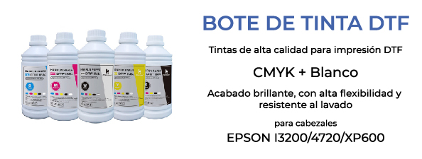 Las impresoras DTF utilizan tinta CMYK y tinta blanca a base de agua para que los diseños salgan brillantes, con alta flexibilidad para que no se agrieten y resistentes al lavado. En nuestra tienda online puedes encontrar en stock botes de 1 litro de CMYK + BLANCO.