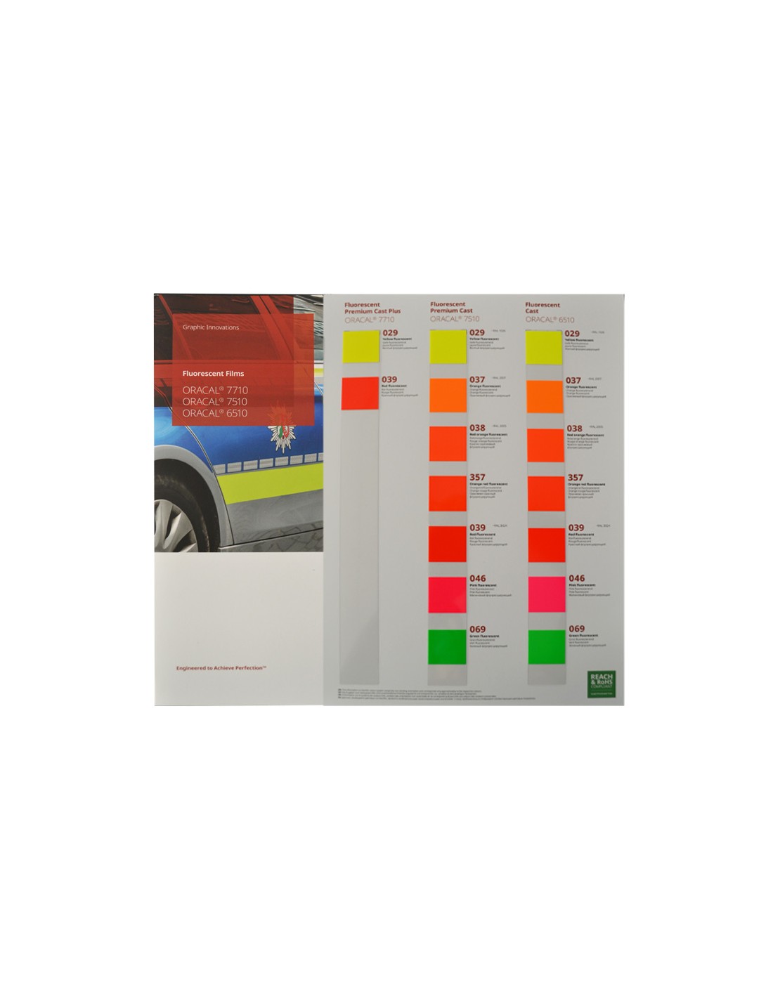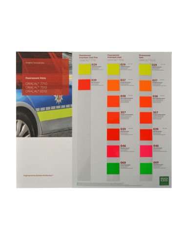 · ORACAL 7710 Fluorescent Premium Cast Plus, ORACAL 7510 Fluorescent Premium Cast y ORACAL 6510 Fluorescent Cast: colores con un efecto fluorescente a la luz diurna, llamativa para fines publicitarios.