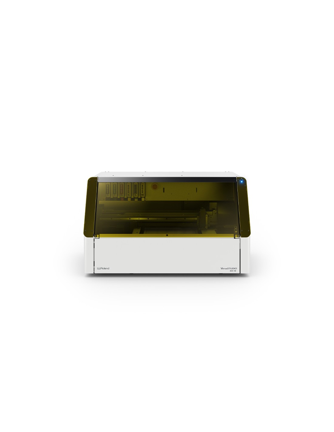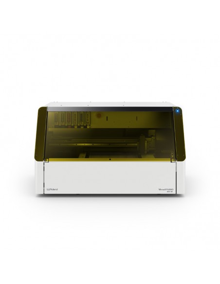 - Impresora plana UV de sobremesa Roland VersaSTUDIO BD-8 para personalizar objetos en 3D e imprimir sobre una amplia variedad de materiales, como plástico, papel, piel y madera, vidrio, metal, etc.