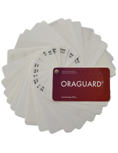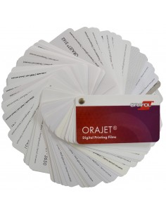 Muestrario de series y acabados de laminados ORAGUARD en abanico · Laminados para protección de impresiones de gran formato.